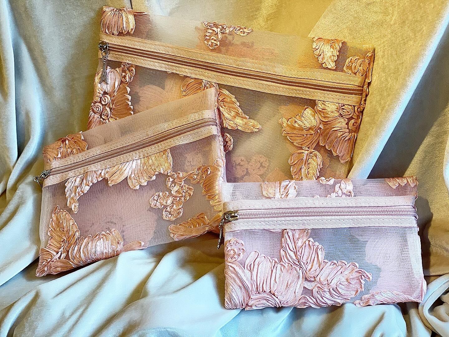 しっかりとしたチュール素材にリボン刺繍でお花がデザインされたフラットポーチです。